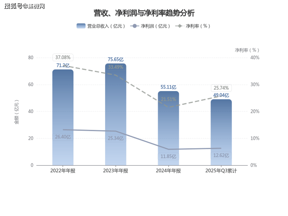 紫光国微2022-2025年的营收与净利润呈现先承压调整后边际回暖的态势:2022年营业总收入71.2亿元、净利润26.4亿元,2023年营收微增至75.65亿元但净利润略降至25.34亿元,2024年受半导体行业周期下行影响,营收大幅下滑至55.11亿元、净利润11.85亿元,而2025年Q3累计营收49.04亿元、净利润12.62亿元已超2024全年净利润,显示出明显的回升迹象。