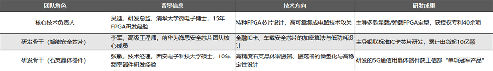 公司研发团队呈现“技术专家领衔+细分领域骨干支撑”的结构,核心技术负责人吴迪深耕FPGA领域15年,主导的星载/弹载FPGA研发成果直接支撑了国防信息化领域的产品需求,契合公司特种集成电路的核心战略;智能安全芯片领域的李军具备头部企业研发经验,其主导的IC卡芯片研发实现了大规模量产,支撑了智能安全业务的市场拓展;石英晶体器件团队的张敏则聚焦高精度器件研发,成果获行业认可,强化了公司在物联网、5G等领域的产品竞争力。研发团队的技术背景与公司“多领域布局IC应用”的战略高度匹配,保障了各业务线的技术迭代速度,同时累计的专利成果与量产经验,为公司在国产替代浪潮中巩固领军地位提供了核心支撑。